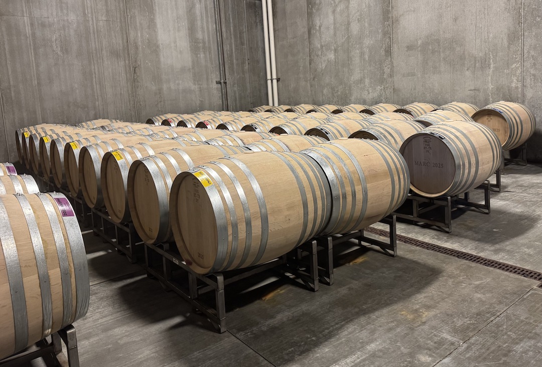 Barrels are arranged on just one level in the functional, spartan Marcassin winery.