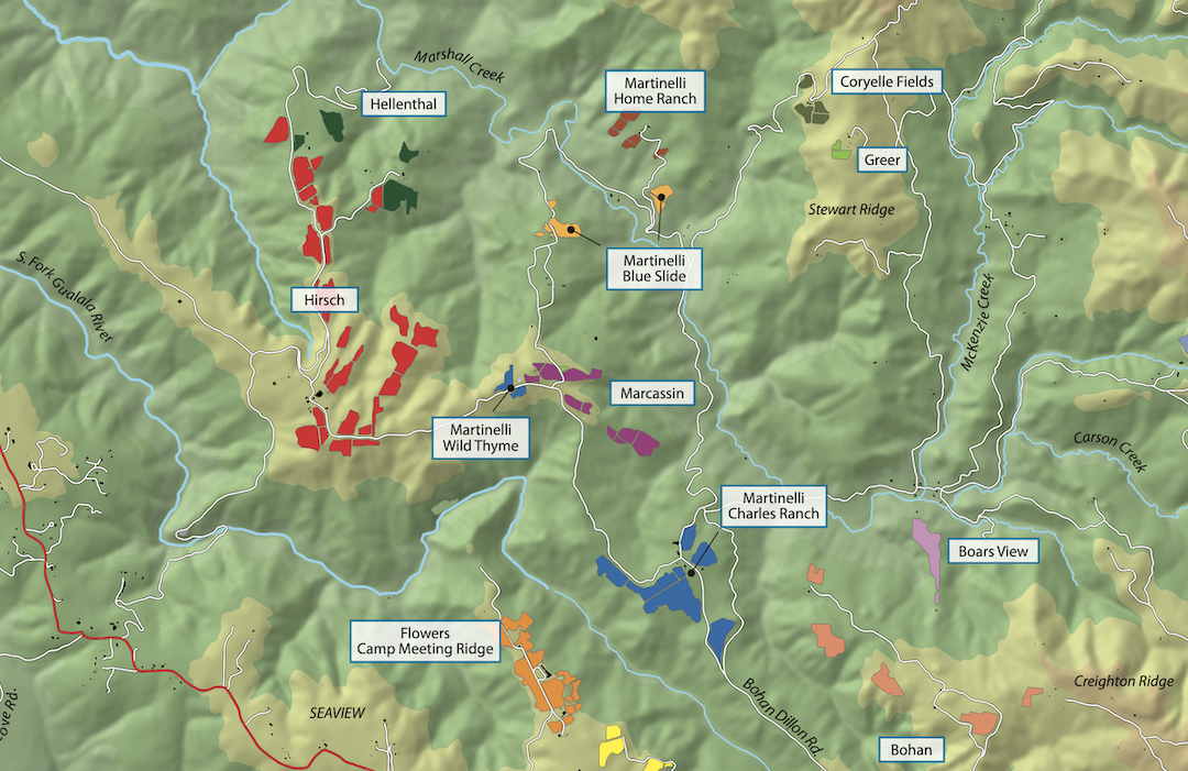 Marcassin and surrounding vineyards, as seen in the forthcoming Vinous Map: The Vineyards of Fort Ross-Seaview, by Antonio Galloni and Alessandro Masnaghetti, © 2026.