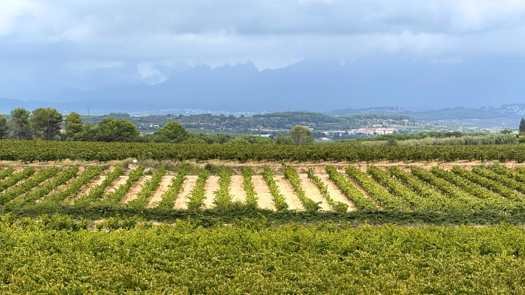 El paisaje de Penedès, cuna de los Cavas de Comtats de Barcelona, donde se recorta la figura icónica de Montesarrat al fondo, tocando las nubes.