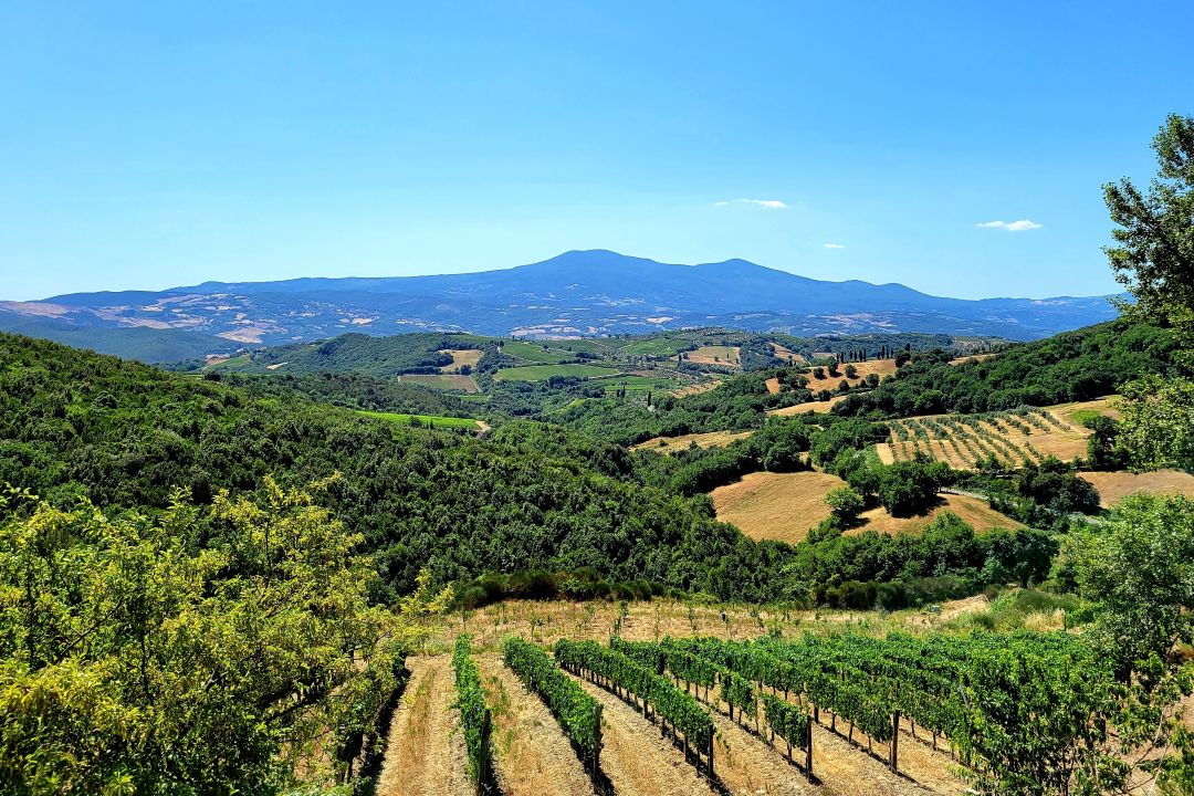 Mount Amiata looms large in the distance, as seen from Montalcino.